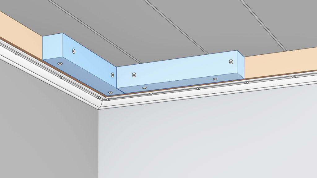 Das Konstruktionsholz wird zuerst ca. alle 40 cm in Waage an die Wand oder Decke gedübelt. Darauf wird das Deckenprofil verschraubt, in das später die Spanndecke eingespannt wird