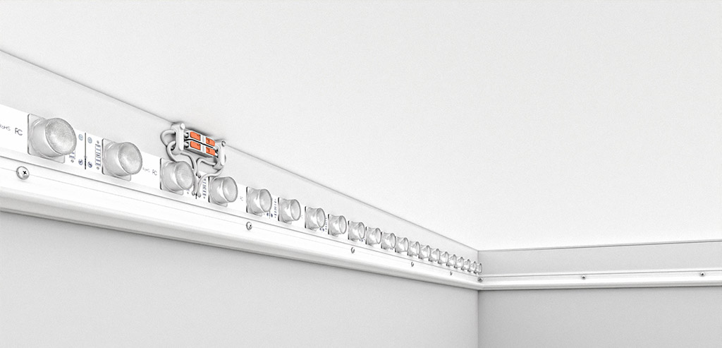 Die LED-Leiste kann bei passendem Untergrund mit dem bereits angebrachten doppelseitigen Klebeband installiert werden. Für zusätzlichen Halt kann sie auch angeschraubt werden. Jede LED-Leiste verfügt an beiden Enden über Kabel, die mit Verbindungsklemmen (nicht im Lieferumfang enthalten) angeschlossen werden können. Um einen Helligkeitsabfall zu vermeiden, sollte alle 72 LEDs (4 LED-Leisten) neu vom Betriebsgerät eingespeist werden. Je nach Grundriss kann die LED-Leiste ringsum montiert werden oder bei schmalen und langen Räumen nur an den beiden langen Seiten.