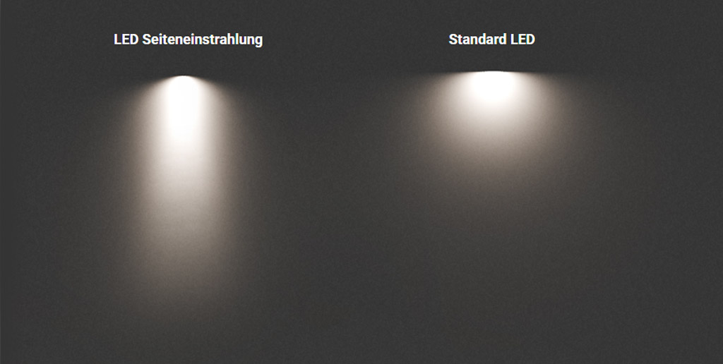 Im Gegensatz zu herkömmlichen LED-Bändern wird das Licht bei dieser LED-Leiste nicht diffus zerstreut. Stattdessen sorgt eine speziell entwickelte Linse für eine gezielte Bündelung, wodurch es deutlich weiter reicht: Mit 2 gegenüberliegenden LED-Leisten können Flächen bis zu 150 cm Abstand gleichmäßig ausgeleuchtet werden.
