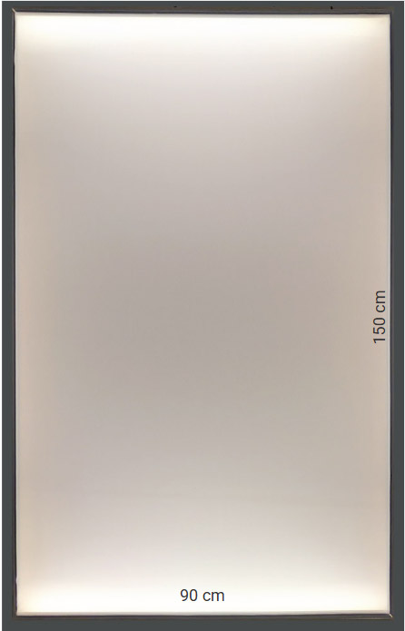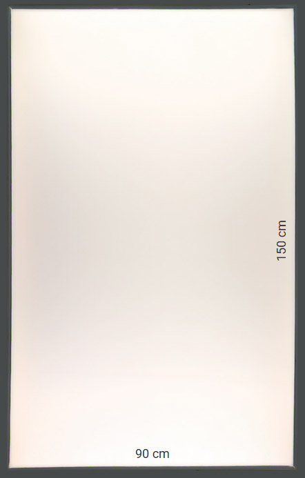 In diesem Beispiel wurde an den 90 cm Seiten jeweils eine LED-Leiste montiert. Dabei ist deutlich zu erkennen, wie viel mehr Licht durch die Linse in die Mitte der Fläche geworfen wird als mit Standard LED-Bändern. Damit ist mit wenigen LEDs eine gleichmäßige Ausleuchtung möglich.