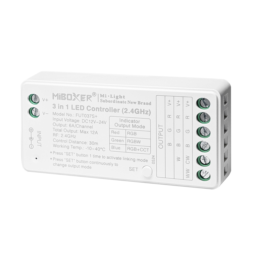 Mit dieser Steuerung hast Du die volle Kontrolle über die Farbe und Helligkeit Deiner RGB-LED-Bänder, damit Du stets das perfekte Ambiente schaffst. Ideal in Kombination mit Fernbedinung und magnetischem Wandhalter.