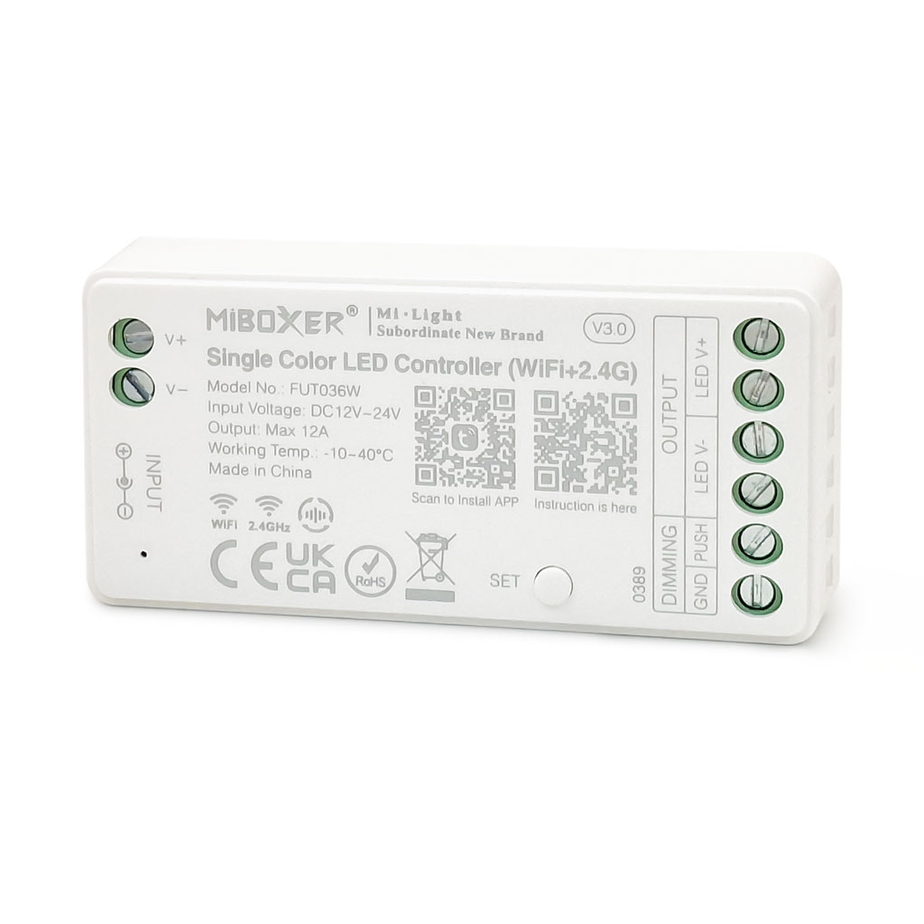 Der LED-Dimmer ist ein praktisches und vielseitiges Steuergerät für einfarbige LED-Streifen mit Spannungen zwischen 12 und 24 Volt. Er ermöglicht das stufenlose Dimmen und einfache Ein- und Ausschalten der Beleuchtung. Das Gerät arbeitet kabellos über WLAN und Funk mit 2,4 GHz und lässt sich bequem per Smartphone-App und Fernbedienung bedienen. Über eine App wie zum Beispiel SmartLife, lassen sich mehrere Dimmer zu Gruppen zusammenfassen. So kann man mehrere LED-Streifen gleichzeitig synchron steuern.